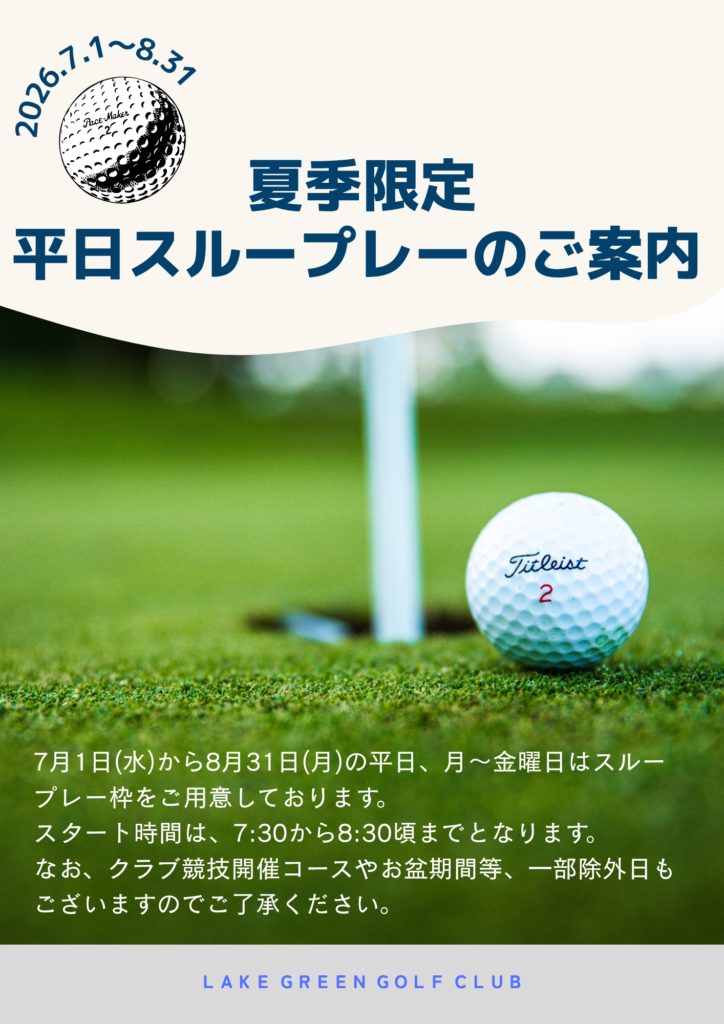 7月1日(水)から8月31日(月)の平日、月~金曜日はスループレー枠をご用意しております。スタート時間は、7:30から8:30頃までとなります。なお、クラブ競技の開催日、お盆期間等、一部除外日もございますのでご了承ください。