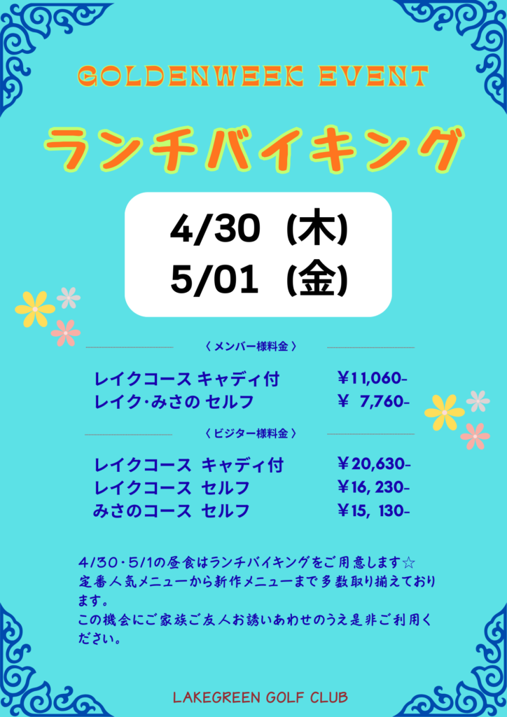 ゴールデンウィークの4/30・5/1の2日間はランチバイキングを開催します。