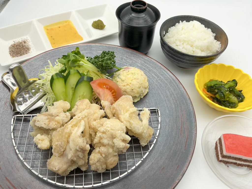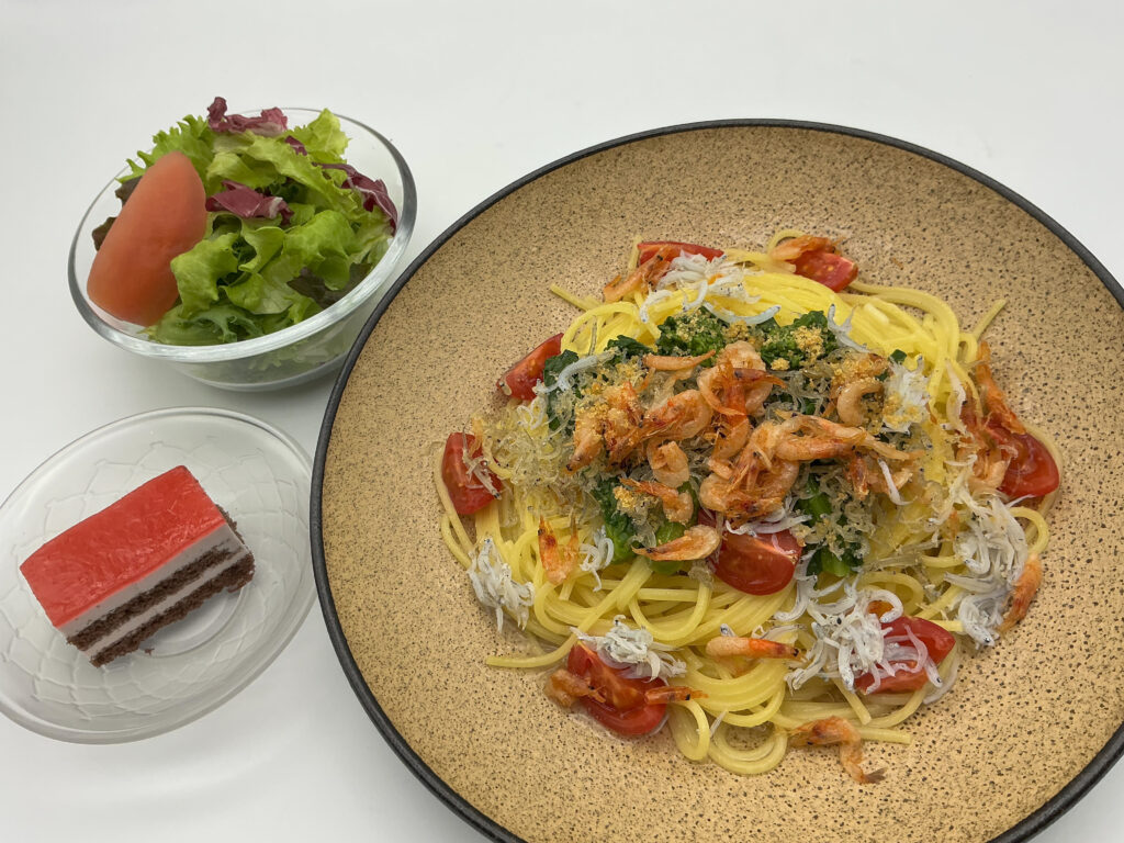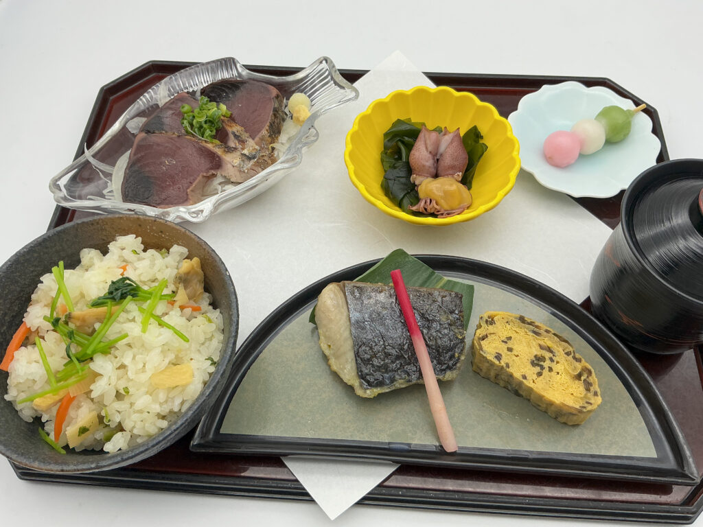 鰆塩焼・鰹のたたき・ホタルイカ酢味噌掛け・塩昆布入り出汁巻き卵・あさりご飯・赤出汁・和菓子